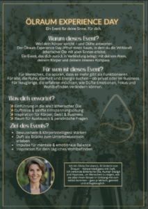 Dein Körper spricht – und Düfte antworten! Nutze die Gelegenheit und erlebe zusammen mit Silvia von Ölraum einen Raum, in dem Du die Wirkkraft ätherischer Öle mit allen Sinnen erlebst. Silvia begleitet Dich auf Deiner Duftreise mit sanften Entspannungsübungen, nimmt Dich mit in die Welt der ätherischen Öle und gibt Inspiration für Körper, Geist & Business.