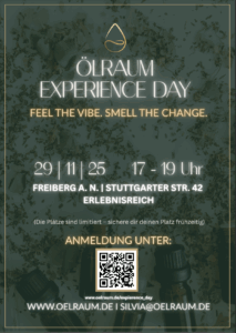 Dein Körper spricht – und Düfte antworten! Nutze die Gelegenheit und erlebe zusammen mit Silvia von Ölraum einen Raum, in dem Du die Wirkkraft ätherischer Öle mit allen Sinnen erlebst. Silvia begleitet Dich auf Deiner Duftreise mit sanften Entspannungsübungen, nimmt Dich mit in die Welt der ätherischen Öle und gibt Inspiration für Körper, Geist & Business.